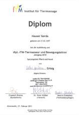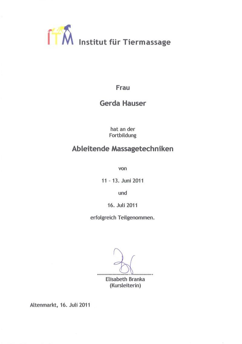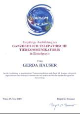 Einjähriger Berufslehrgang beim ITM, Diplomprüfung 27.2.2011 Dipl. Tiermasseurin und Bewegungslehrerin Dipl. ganzheitliche telepathische Tierkommunikatorin Magnified Healing (Arbeit mit Heilenergie) © Gerda Hauser 2011 Einjähriger Berufslehrgang bei Birgit Brunner in Wien Abschluß 25.5.2009 Seminar /Serasim: Master Teacher in Magnified Healing,  2500 Baden, 4.10.2009 ITM-Seminar: ableitende Massagetechniken Abschluss 16.7.2011 ITM ausschwemmende Massagetechnik